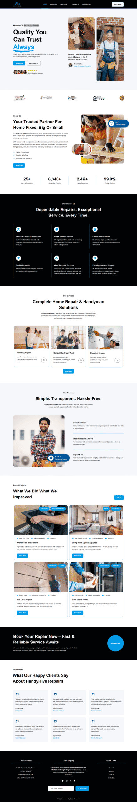 Digital Promotix delivered a clean, user-friendly website for HandyHive Repairs, a local home services company offering everything from plumbing and painting to electrical and general handyman work. The site was built to make service discovery and booking fast and intuitive—designed with the busy homeowner in mind.